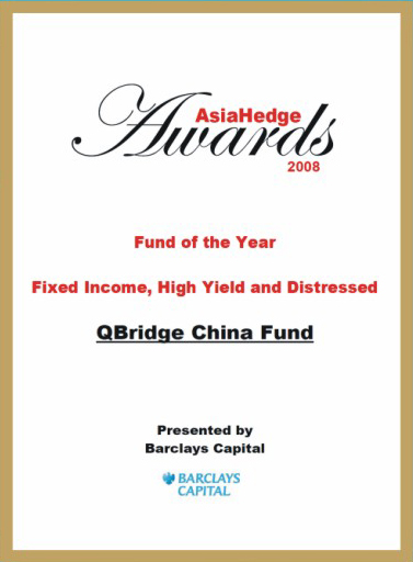 2008年 由“亚洲对冲基金委员会”颁发的“年度最佳固定收益及不良资产类投资基金奖”